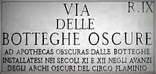 Botteghe Oscure was established in 1948.[1][2] The magazine was named after Rome’s via delle Botteghe Oscure (Latin: Ad Apothecas Obscuras), where the editorial office was located;[1] during the Middle Ages the street's "dark shops" came to be installed under the dark arches of the Circus Flaminius (illustration of a street sign).