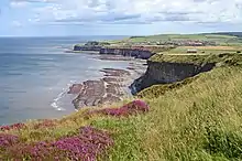 Just north of the village are some of the highest cliffs in England, at 203 metres (666 ft) above sea level.[1] Boulby Cliff was mined for alum and in A Picturesque History of Yorkshire (1901) the face of the headland is described as being "dotted" with alum-works and miners cottages.[6] This mineral was used as a mordant to improve the strength and permanency of colour when dyeing cloth. This mining was relatively short lived as a cheaper method was developed soon after the boom in alum mining. The ruined remnants of the mines can still be seen from the cliff top when walking the Cleveland Way between Staithes and Skinningrove. To the north-west of the village is Boulby Quarries a Site of Special Scientific Interest designated due to its geological interest.