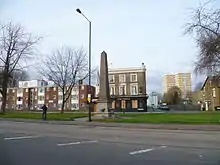 Bounds Green Road with the Catharine Smithies obelisk and drinking fountain in the background.