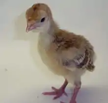The Bourbon Red is a tall, high-breasted turkey, characterized by its deep mahogany-red body color. The wing primaries and secondaries are white, as are the main tail feathers.[9]: 454 The beak is dark at the base, lightening to a horn-colour at the tip. The shanks and feet are a deep reddish horn in young birds, becoming pink with maturity.[2][10]