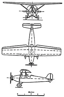 Its undercarriage was fixed and conventional, with a track of 1.80 m (71 in). Each main wheel was mounted on a hinged steel cranked axle and a backward-reaching drag strut, both from the central fuselage underside. A longer, telescopic strut to mid-fuselage containing rubber rings acted as a shock absorber, though oleo struts could be fitted instead. There was a spring-steel tailskid.[2]