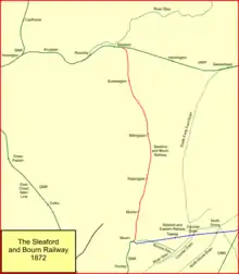 Firbank's tender of £29,363 for construction of the line was accepted on 2 August 1870. An Act of 24 July 1871 permitted a slight deviation at Bourn to allow the line to terminate by a junction with the Bourn and Lynn Joint Railway. The railway was built as cheaply as possible. Except for a passing place at Billingborough, it was single track. Commencing by a junction at Sleaford the line ran for 17 miles 12 chains to Bourn junction (later Bourne East junction).[4]