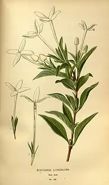 - ↑ Blackwell, Will H. Jr. (1968). "Revision of Bouvardia (Rubiaceae)". Annals of the Missouri Botanical Garden. 55 (1): 1–30 [17–18]. doi:10.2307/2394817. JSTOR 2394817.