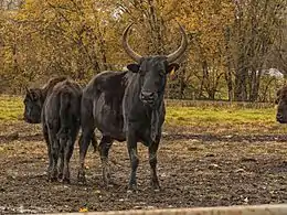 Wild cattle are usually massive bovids that are stout-bodied with thick, short legs.[26][1][27][8] Some species can reach impressive body-sizes such as wild water buffalo, wild yak, American bison, and European bison, which can weigh between 700 and 1,200 kilograms and these species can attain a shoulder height more than 1.9 meters.[27] The gaur can weigh up to 1,500 kilograms and attain a shoulder height up to 2.2 meters.[5] There are some breeds of domestic cattle that can be even larger than both wild species, one of them being the Chianina, bulls of which can weigh from 1,200 to 1,500 kilograms and reach a similar height to the gaur.[28][29] There are, however, several species of buffalo that live on the various islands in Indonesia are dwarf species, such as the tamaraw and the anoa, that weigh between 200 and 300 kilograms.[27][8] Furthermore, not all species of bovin look like cattle, such as the saola which looks more like antelope (a fact that caused some confusion among bovid biologists[21]). What all bovins or wild cattle do have in common is both sexes have the presence of smooth horns, instead of annulated horns seen in most other bovids.[27][12][8] In bovinans the horns are round, while in bubalinans they are flattened.[26] Like the spiral-horned antelopes there is extreme sexual dimorphism in bovins, though it is emphasis on the body size and the size of the horns.[26][27][8] Males are significantly larger than the females, which most of their features are exaggerated with massive humps, large necks, and in some species the presence of a dewlap.[26][8] Males and females exhibit sexual monochromatism (with the exception of the banteng, where males are a dark chestnut while females are just chestnut), though the male coloration hues are darker than the females.[26] Coloration can be uniform or with some white markings, from black to brown.[26][8]