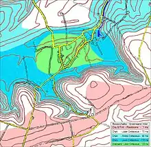The main portion of the village is formed on the unique 'Bowerchalke greensand inlier' (an area of older rock completely surrounded by younger layers), highlighted in green on the adjacent map. It is not immediately obvious to the naked eye or on the standard Ordnance Survey maps with 10 metre contours[26] but the apex is strikingly characterised by the 'island' drawn on the Andrews' and Dury's 1773 map.[27] Its presence can be detected in the friable sandy soils in the centre of the village.