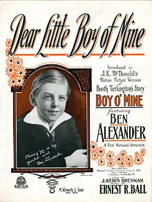 Boy of Mine is a 1923 American silent family drama film directed by William Beaudine that was based upon a short story by Booth Tarkington. It stars Ben Alexander, Rockliffe Fellowes, and Henry B. Walthall. Wendy L. Marshall stated that "Beaudine had the Midas touch when it came to directing children" in films like this and Penrod and Sam.[1]