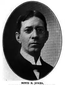 Boyd B. Jones (October 13, 1856 – June 5, 1930) was an American attorney who served as the United States Attorney for the District of Massachusetts from 1897 to 1901.[4] He later served on the faculty at the Boston University School of Law[3] and was one of the founding members of the Sentinels of the Republic.[5]