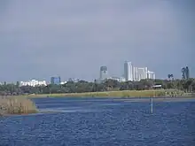 View of Downtown St. Petersburg from boardwalk over protected wetlands.
