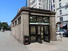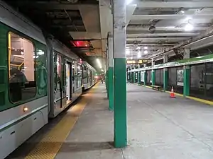 Boylston station (also signed as Boylston Street) is a light rail station on the MBTA Green Line in downtown Boston, Massachusetts, located on the southeast corner of Boston Common at the intersection of Boylston Street and Tremont Street. A southbound street-level stop for the SL5 route of the bus rapid transit Silver Line is outside fare control. The station has two island platforms; each has one disused track, making them effectively side platforms. Boylston is not accessible for Green Line trains.