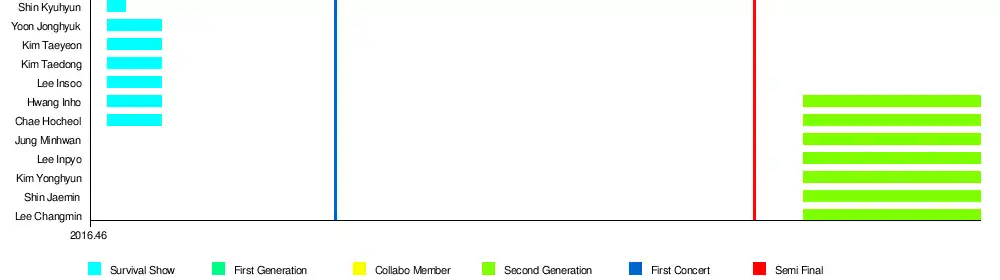 After completing 260 concerts,[3] the final group was selected from "The Final", consist of eight members: Yoo Youngdoo (Yoo Jiahn), Jeong Yeontae, Hwang Inho, Han Hyunuk, Isaac Voo, Lee Inpyo, Kim Jinsub and Kim Sunghyun. They debuted on October 26, 2017 as IN2IT.[12]