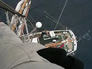 The starboard main-brace and main-topsail-braces are clearly silhouetted against the sea in this photo of the Prince William's bridge and stern deck from her masthead. The main-topgallant and main-royal braces run forwards to the foremast and are not visible in this picture.
