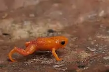 Brachycephalus pitanga, the red pumpkin toadlet, is a small and brightly coloured species of anuran in the family Brachycephalidae.[1][2][3] It is endemic to Atlantic rainforests in São Paulo state of southeastern Brazil, and only known from four localities at an altitude of 900–1,140 m (2,950–3,740 ft) in Ubatuba (the type locality) and São Luiz do Paraitinga.[4] It can be very common where found,[5] and two of the known localities are protected by the Serra do Mar State Park.[4] Unlike many other pumpkin toadlets (genus Brachycephalus), the red pumpkin toadlet is not considered threatened.[4]