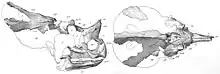 Among the five original specimens parts of three skulls were discovered, detached from their owner's body and fragmented.[3] Despite this, the skull showed that the animal had only small bumps over the eyes rather than full-grown horns like in the more famous ceratopsians such as Triceratops.[3] The nasal horn was thick and low, while its neck frill was moderately large.[3] Unfortunately the specimens were incomplete so it cannot be determined if there were parietal openings in the frill like some other ceratopsians possessed.[3]