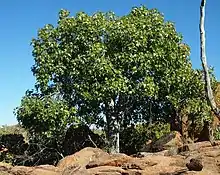 Brachychiton collinus, the outcrop kurrajong, is a small deciduous tree found growing in some of the harshest climatic conditions in Australia.[1] This small tree is commonly found between Cloncurry and Mount Isa in North-West Queensland, Australia. The North-West savannah zone of Queensland is characterised by very high summer temperatures of up to 50 degrees Celsius and an unpredictable monsoonal rainfall that may deliver the whole annual rainfall of some 50 cm overnight. This tree most often grows on rocky outcrops where little other scrub, grasses or other understory plants can survive. It is probable that this preference for bare rocky outcrops is a function of the tree's sensitivity to fire. Most brachychiton species do not survive a strong grass or brush fire.