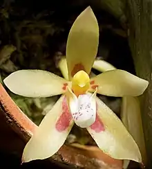 Brachypeza, commonly known as sage orchids, is a genus of flowering plants from the orchid family, Orchidaceae. Orchids in this genus have short stems with fleshy leaves and arching flowering stems with short-lived flowers. The sepals and petals are similar in size and shape and the labellum is pouch-like and suspended at the base of the flower. Sage orchids occur in tropical areas from Indochina to New Guinea.[1][2]