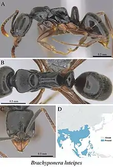 - Brachyponera luteipes luteipes Karavaiev, 1925 - New Zealand, Borneo, Palau, Philippines, Bangladesh, India, Myanmar, Nicobar Islands, Sri Lanka, Thailand, Vietnam, China, Japan