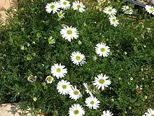 This species has an erect, matting growth habit growing to 45 cm in height. The foliage is fine and deeply divided,[2] The flowerheads arise above the foliage on 4 to 40 cm long peduncles. The ray florets are mauve, pink or white and are 7 to 10 mm long.[2][3] The main flowerering season is early autumn to mid winter, but the daisy-like flowerheads may appear throughout the year.