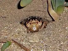 Brachytrupes megacephalus can reach a length of about 40 millimetres (1.6 in). This species is characterized by a very large head (hence the species name megacephalus) and strong jaws. The tibia of the front and rear legs are armed with big teeth which facilitate the action of digging the deep holes in sandy soils in which these crickets live. These insects have crepuscular and nocturnal habits. The mating period extends from mid-March to the end of April. After mating, the males keep the females captive in their holes until they lay their eggs.[3][4][5]