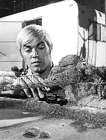 ![]() Dennis Cole as Davey Evans plans a stunt by playing with a model | |