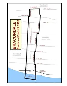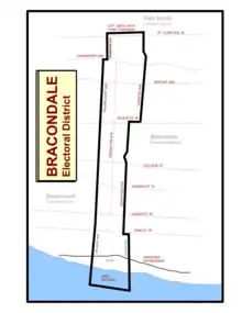 Bracondale was a long and narrow constituency, ranging from the Canadian National Exhibition Grounds in the south to the city limits immediately north of St. Clair Avenue, in Toronto's west-end. It included parts of the present-day neighbourhoods that belong to Bracondale Hill, Davenport, Dovercourt Park, Dufferin Grove, Little Portugal, and Liberty Village. Its southern boundary was Lake Ontario. Its eastern boundary started on the west-side of Strachan Avenue. It went north on Strachan to Queen Street West and jogged westward along Queen's south side to Crawford Avenue. It then went north on Crawford's westside until Bloor Street West. It then jogged east on Bloor's north side to Christie Avenue. It then went along Christie to the northern boundary, the city limits just north of St. Clair Avenue West. It jogged westward along the city limits to Oakwood Avenue. It then went south along Oakwood's eastside to Davenport Road. It then jogged along Davenport's south-side to Dovercourt Road. It then went south on Dovercourt's east-side to Atlantic Avenue. On Atlantic's east-side to Lake Ontario.[10][11]
