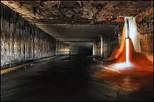 The dale is known to be at the northern edge of the Yorkshire Coalfield, which yielded coal, fireclay, ironstone, sandstone and brick clay, most of which were quarried or mined in the Bradford area and contributed to its enormous growth in the 18th and 19th centuries.[77] In 1866, all of the collieries in the Bradford district produced a combined 1,900,000 tonnes (2,100,000 tons) of coal, most of which was used in smelting of metals. This was the peak production time and most of these workings were outside of Bradford Dale,[78] though several workings existed around Bierley, which supplied the ironworks there.[79] Whilst the coal north of Bradford was laid down extensively, the seams were thin and not very productive. The coal was known to be of poor quality, yet various mining ventures acquired names for their workings (Bolton Woods Coal Mine, Bunker Hill Coal Mine, etc).[80][81] The cluster of coal workings south of the city around Low Moor were better equipped geologically to produce sufficient quantities of coal.[82] In 1924, just three collieries were active in the district, though some opencasting was resurrected during the Second World War.[83]