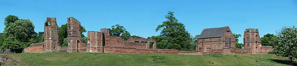 The park was originally enclosed using a bank and ditch topped by vertical pales of oak. These first ditchworks cross the River Lyn east of the Little Matlock Gorge. A parker, living in a moated house, was the only occupant, maintaining stocks of deer for the lord of Groby Manor to hunt.[8] The park was greatly extended by the first marquis in the late 15th century, to occupy land previously farmed by both Newtown Linford and the now lost village of Bradgate.[8] Lichen dating of the dry-stone walls suggest that the north and west boundary walls were built in the 17th and early 18th centuries, when Bradgate was still occupied by the earls of Stamford. The walled spinneys are a later feature, built and planted in the early 19th century as coverts for shooting.[9] The park still has herds of red and fallow deer, which probably have an unbroken occupancy since medieval times.[8]