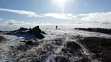 The Precambrian outcrops include four 'type-members' of the Charnian Supergroup,[25] formed some 560 million years ago.[24] Bradgate is one of the few areas of Britain where these ancient basement rocks can be seen at the surface. The oldest of the Charnian rocks within Bradgate Park are the rocks nearest the Old John and memorial summits.[24] This is the Beacon Hill Formation. It appears to have formed in deep water, out of sediments of volcanic ash and other pyroclastic material, which were then subject to slumping and submarine flows, to create rocks with various degrees of stratification. The volcano itself was in the north-west of Charnwood Forest, and the whole area was in the southern tropic, off the coast of the continent of Gondwana. (A modern parallel might be the sea surrounding Montserrat.[24]) Some of the layers show great variation, showing how an initial volcanic eruption would result in larger sediments rapidly settling to create course-grained tuff, followed by settling of much finer material to form much smoother dust-tuffs – smooth light-grey to creamy coloured rocks seen to the north of Old John.[26] The various layers were subsequently deeply buried, subject to vast periods of mountain-building (orogeny), heat, pressure and erosion of overlying material, to expose the hard, jagged outcrops seen in the photograph.
