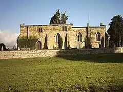 The village's parish church is dedicated to All Saints.[6] Primarily constructed in the late 14th century, but incorporating some earlier work, it has an unusual layout with an aisleless nave and chancel, and no tower.[6][7] In 1891 the church was described as "an edifice in the Decorated style of the early 14th century, consists of a small chancel and nave under a single roof, south porch and a wooden turret at the west end containing 3 bells, two of which date from 1722, the tenor being undated".[5]