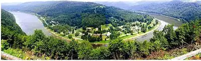 Brady's Bend, also known as Bradys Bend, is a location in East Brady, Clarion County, Pennsylvania. It is named for Captain Samuel Brady (1756–1795), frontier scout and the subject of many legends. The photo is a composite of three shots taken about 1,400 ft. above sea level. Near this location on the Allegheny River in Western Pennsylvania June 1779—in what was then Seneca territory – Brady led a force seeking to redress the killing of a settler and her four children, and the taking of two children as prisoners. The force surrounded a party of seven Indians—apparently both Seneca and Munsee – killing their leader (a Munsee warrior) and freeing the two children.[1]