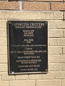 Brady Street Beasts includes a large blue reindeer accompanied by a red rat and a green dragonfly.[2] The sculptures are constructed from sheet metal welded together on top of a substructure of metal rods. The reindeer appears to have scaled to the top of an exhaust chimney above a public works building. Its yellow antlers extend into the sky, and it grasps a paint can from which blue liquid appears to flow into the opening of the chimney. On the opposite side of the chimney, the rat climbs upward. On the roof of the building adjacent to the chimney, a bug-eyed green dragonfly stands with a telescope to its eye. A nearby weather vane includes three words, each painted on a bar with two arrowheads on either end: water, reflection, good food.