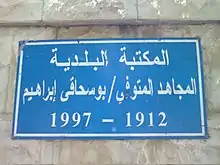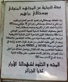 Brahim Boushaki (Arabic: إبراهيم بن علي بوسحاقي Ibrahim ibn Ali al-Boushaki) (1912 CE/1330 AH – 1997 CE/1418 AH), was an Algerian Scholar, Imam and Sufi Sheikh.[1] He was born in the village of Soumâa near the town of Thénia 53 km east of Algiers. He was raised in a very spiritual environment within Zawiyet Sidi Boushaki with high Islamic values and ethics. He had great interpersonal skills and devoted his entire life in service of Islam and Algeria according to the Algerian Islamic reference.[2]