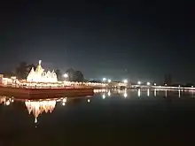 A sacred shrine dedicated to Shiva stands within the sarovar, accessible by a small bridge. According to scriptures, bathing in this sarovar increases the sanctity of performing the 'ashvamedh yajna'. The Gita Jayanti celebrations are held each year in the last week of November and early December when a 'deep daan' ceremony of floating lamps in water and [Aarti] occurs.[2] This also happens to be the time when migratory birds from distant places arrive at the sarovar. The Birla Gita Mandir and Baba Nath's haveli and temple are the neighbouring attractions.