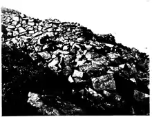 On 10 August 1908, a Royal Commission was authorised and appointed by King Edward VII to 'make an inventory of the Ancient and Historical Monuments and Constructions connected with or illustrative of the contemporary culture, civilisation and conditions of life of the people in Wales and Monmouthshire from the earliest times, and to specify those which seem most worthy of preservation'. From 1909, the newly-founded commission made efforts to rescue the already partly-destroyed site from further harm caused by the extensive quarrying being undertaken by the Darbishire family.[15] Several local newspaper articles from June 1909 attest to this, reporting that MP for Carmarthen District Llewelyn Williams raised the issue of Braich-y-Dinas (named as 'Pendinas') with the Prime Minister, only to be told that the 600 jobs sustained by the quarry took precedence over the prehistoric remains.[16][17] Having failed in Parliament, attention was turned 'to the creation of a strong public opinion to bring pressure to bear upon the quarrying company concerned with a view of the preservation of the summit of a mountain at Penmaenmawr.'[18] In 1910, an article about the destruction of Braich-y-Dinas appeared in British newspaper The Sphere, which was also picked up and reported across the Atlantic in The New York Times .[19] Ultimately unsuccessful and faced with the imminent destruction of the site, members of the commission made several visits to the Braich-y-Dinas hillfort in order to preserve some written record of the remaining structures; and an extensive survey was undertaken by Harold Hughes for the Cambrian Archaeological Association.[20][21]
