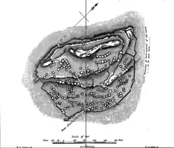 One of the earliest written accounts of the fort comes from Thomas Pennant, who visited the site as part of his 'A Tour in Wales' series (1778–1783). He gives the original height of the mountain as 1545 feet and noted its excellent preservation.[4] The hilltop was defended by massive ramparts of roughly coursed rubble masonry, with no orthostats. By the mid 19th Century these still stood in places to a height of 9 ft., and varied from 8 to 15 ft. in thickness. The number and character of the entrances were uncertain. The interior contained 90 or more huts of various shapes but mostly oval with a usual diameter of 10–20 ft. Their walls were of similar construction to the rampart, about 5 or 6 ft. thick, and stood in places to a height of 4 ft. Summit top cairns were noted by another 18th Century antiquarian – Governor Thomas Pownall – (writing in 1771),[5] and indeed three are included on the detailed 1877 plan (see image in infobox). These are speculated to have been early Bronze Age, which would date organised human activity on the site to at least c. 2000-2500 BC.[6] The wider area is well known for its Neolithic activity, and indeed the Neolithic Axe factory of Graig Lwyd – one of the largest in Wales – can be found nestled at the Southeast corner.[7]