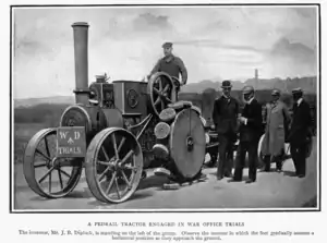 This desire for greater traction in road locomotives (traction engines) probably led directly to the pedrail system which he patented in 1899.[9] In this design the continuously laid tracks contain rollers and the rails roll over them, which gave it the capability for crossing banks and ditches, as well as soft ground; a capability that attracted the attention of the War Office. The practical realisation of this was the Pedrail Tractor made by Fosters of Lincoln, from which an account in 1904 of a trial attended by members of the War Office proved its ability to tow a heavy load over rough ground, climbs hills and turn with ease, and show a 2 ton drawbar pull.[10]