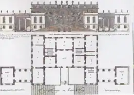 Bramham Park from Jones's Views of the Seats of Noblemen and Gentlemen (1829). A carriage ramp on the entrance facade conveys visitors to the principal entrance on the piano nobile.