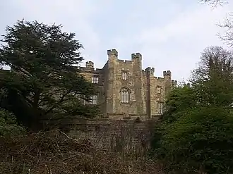 Brancepeth Castle from the east, showing the two 19th-century gate towers (right) and older chapel and curtain walls (centre and left)
