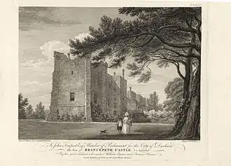 A succession of buildings has been on the site. The first was a Norman castle built by the Bulmers, which was rebuilt by the Nevilles in the late 14th century.[1] For many years the castle was owned by the Neville family until in 1569 it was confiscated by the Crown following the family's involvement in the Rising of the North.[2]