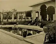 The 3+12-story mansion built in 1897, enclosing an 1890 house that had been built on the site by Mary Pratt Sprague (later Mrs. Edward Brandegee). The mansion has elaborate interior decorations, including a dining room paneled in mahogany, a second dining room in oak, and a ballroom with elaborate candelabras and chandeliers, with tapestries by Gobelins. The house stands on a slight rise, looking over a landscaped formal garden, which included a pool and an open summer house.[2]
