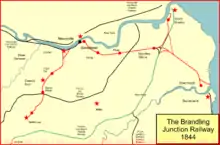 This intersected the Tanfield Waggonway, and the Brandling Junction Railway was planned to meet the Newcastle and Carlisle Railway a short distance west of Redheugh. At the same time the Tanfield Waggonway was to have a junction made with the Newcastle and Carlisle Railway, enabling through running to the Brandling Junction line by using a short section of the N&CR. From May 1837 the Brandling Junction company began relaying the Tanfield line with heavier and better rails, and by late 1839 it had been relaid for much of its course as far as Tanfield Lea. In 1840 Tanfield Moor was reached and from that time most of the output of the mine went to Dunston over the Tanfield line;[5] this was a severe loss to the Stanhope and Tyne Railway which had been carrying the traffic.[4]