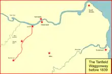 Practically the whole of the coals from the Tanfield and South Moor districts came down to the River Tyne at Dunston, and the Grand Allies built special facilities there for the purpose.[4] The Tanfield Waggonway was later extended to Shield Row colliery, eight miles from the Tyne.[9]