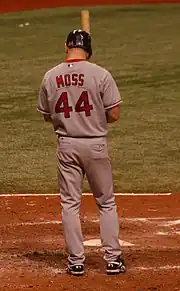 On July 30, 2015, the Indians traded Moss to the St. Louis Cardinals in exchange for minor league pitcher Rob Kaminsky.[21] He collected his first hit with the Cardinals, a single, on August 1 in a 6–2 loss to the Colorado Rockies.[22] His first RBI for the club occurred the next day, also against the Rockies, a game-winning single to score Jason Heyward in the bottom of the ninth inning.[23] He hit his first home run as a Cardinal on August 27 in the top of the fifth against the Arizona Diamondbacks. On September 1, Moss hit a three-run, walk-off home run against the Washington Nationals at Busch Stadium for an 8–5 win.[24] He combined to hit 19 home runs and 58 RBI with Cleveland and St. Louis in 2015.[25]