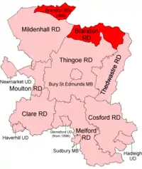 Brandon was a rural district in Suffolk, England from 1894 to 1935. The district was created in 1894 as the Suffolk part of the Thetford rural sanitary district, the Norfolk part becoming Thetford Rural District.[1] This left the westernmost parishes of Brandon and Santon Downham detached from the rest of the district.
