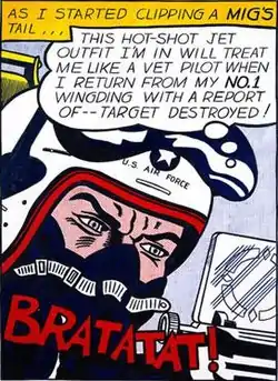 Lichtenstein was a trained United States Army pilot, draftsman and artist as well as a World War II veteran who never saw active combat.[1][2] His list of aeronautical themed works is extensive. Within that genre, Lichtenstein has produced several works featuring pilots situated in cockpits during air combat such as Jet Pilot (1962), Brattata (1962), Bratatat! (1963), and Okay Hot-Shot, Okay! (1963).[3] Bratatat! along with Whaam! and Varoom! are among Lichtenstein's most recognizable onomatopoeic works.[4]