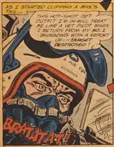 The source of Bratatat! is All-American Men of War #90 (March–April 1962, DC Comics).[5] Bratatat! depicts a jet fighter pilot engaged in military conflict.[6] The black and white sketch of this work has been on a worldwide tour, accompanied by DC Comics artwork.[7][8]