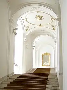 Behind the entrance is an arcade corridor leading to a large Baroque staircase which, in turn, leads to the exhibitions of the Slovak National Museum on the second floor. The west wing of this floor houses the 4 halls of the Treasure Chamber (opened in 1988) with a collection of the most precious archaeological finds and other objects of Slovakia, including the prehistoric statue called the Venus of Moravany. The third floor houses the exhibition on the History of Slovakia. The first floor in the south wing of the building houses the rooms of Slovak parliament — the National Council of the Slovak Republic – including furnishings from the 16th century. The northern wing of the building- the former Baroque chapel, houses the Music Hall in which concerts are held. The courtyard includes the entrance to the Knights Hall.