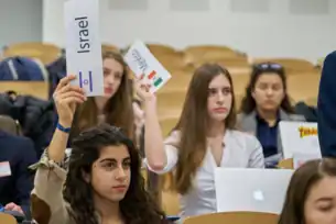 A picture of students participating in a committee session.