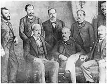 Photo of the board of the Abolitionist Confederation, May 16, 1888. Standing, from right to left: José do Patrocínio, Luís de Andrade, Inácio von Doellinger, Praxedes Medella and Luiz Pereira. Seated, from right to left: André Rebouças, João Clapp and José de Seixas Magalhães.