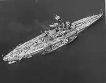 São Paulo's refit was finished on 17 January 1920 and it returned to Brazil; on 15 July Minas Geraes departed for New York for its own refit.[49][50] Beginning on 22 August,[51] the day it arrived,[52] and finishing on 4 October 1921,[51] the battleship was dramatically modernized, with Sperry fire-control equipment and Bausch and Lomb range-finders for the two superfiring turrets fore and aft. A vertical armor bulkhead was fitted inside the main turrets, and the secondary battery of 4.7 in (120 mm) guns was reduced from 22 to 12; five guns in casemates were removed from each side. A few modern AA guns were fitted: two 3"/50 caliber guns from Bethlehem Steel were added on the aft superstructure, 37 mm (1.5 in) guns were added near each turret, and 3-pounder guns were removed from the tops of turrets.[49] While being refitted on 16 September 1921, a squad of Brazilian sailors stood at attention on the rear deck of the ship as the remains of the crew of the ZR-2 dirigible disaster passed by on the British light cruiser HMS Dauntless.[53]