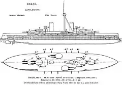 Minas Geraes left the Tyne on 5 February 1910 and traveled to Plymouth before beginning a voyage to the United States on 8 February.[29] When the ship reached Norfolk, Virginia, it escorted the American armored cruiser North Carolina, which was carrying the body of the former Brazilian ambassador to the United States Joaquim Nabuco (who had died in Washington, D.C., on 17 January) to Rio de Janeiro.[30] The two ships set sail on 17 March 1910 and reached Rio de Janeiro one month later,[31] where Minas Geraes was commissioned into the Brazilian Navy on 18 April.[6]